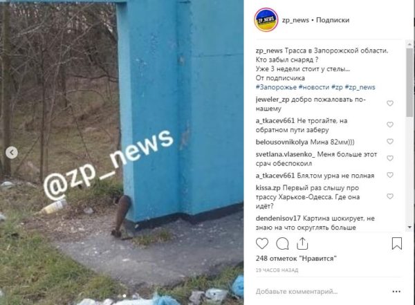 По словам автора поста, уже несколько недель кряду возле стелы, установленной на въезде в Михайловский район Запорожской области, стоит снаряд времен минувших войн.