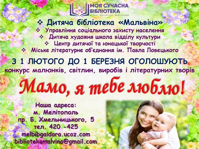 Мелитопольская центральная детская библиотека «Мальвина» (пр. Хмельницкого, 5) приглашает с 1 февраля по 1 марта (включительно) принять участие в конкурсе рисунков, фотографий, изделий и произведений «Мама, я тебя люблю!». А в воскресенье эта библиотека ждет желающих посетить в 12.00 киносеанс 3D кинотеатра «Детские мечты», где покажут мультфильм «Щелкунчик». Также здесь в 10.00 проведут мастер-класс: Поздравительная открытка «С любовью в сердце» (ко Дню Святого Валентина).