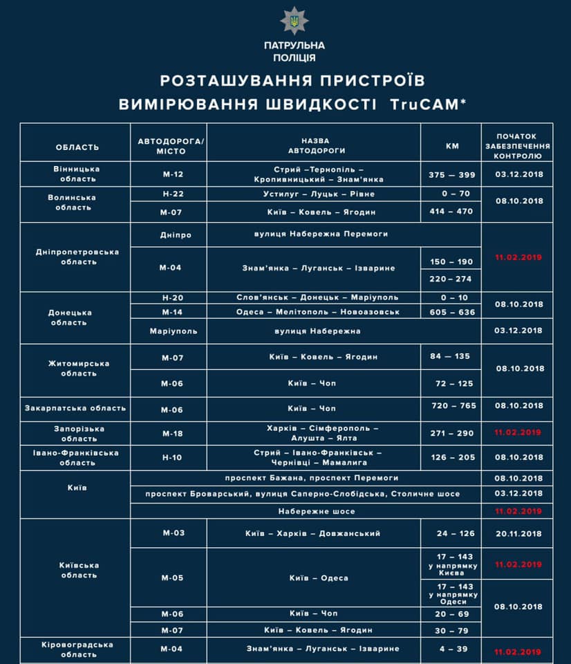 В полиции напомнили, что на данный момент в Украине работает 30 приборов TruCam. С 11 февраля, таким образом, общее количество устройств для измерения скорости достигнет 50 единиц.