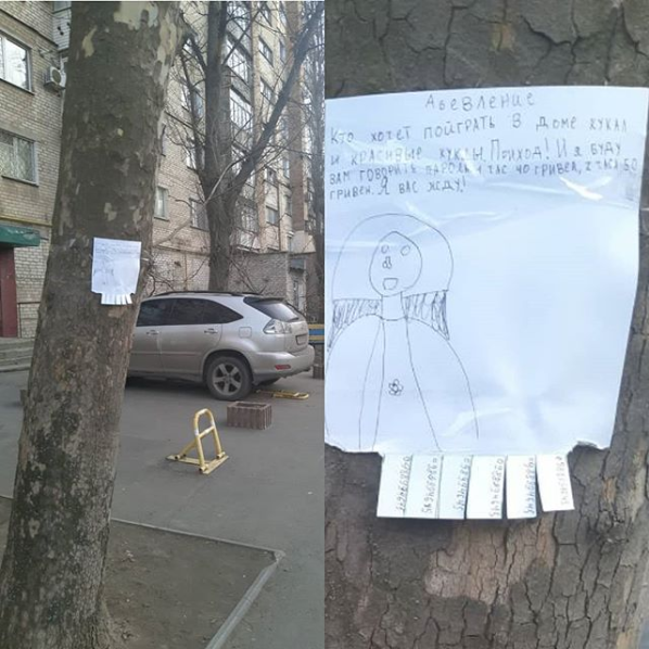 Текст его следующий: «Кто хочет поиграть в доме кукол и красивые куклы. Приходи и я буду говорить вам пароль. 1 час 40 гривен, 2 часа 50 гривен. Я вас жду», - гласит надпись, сделанная от руки.