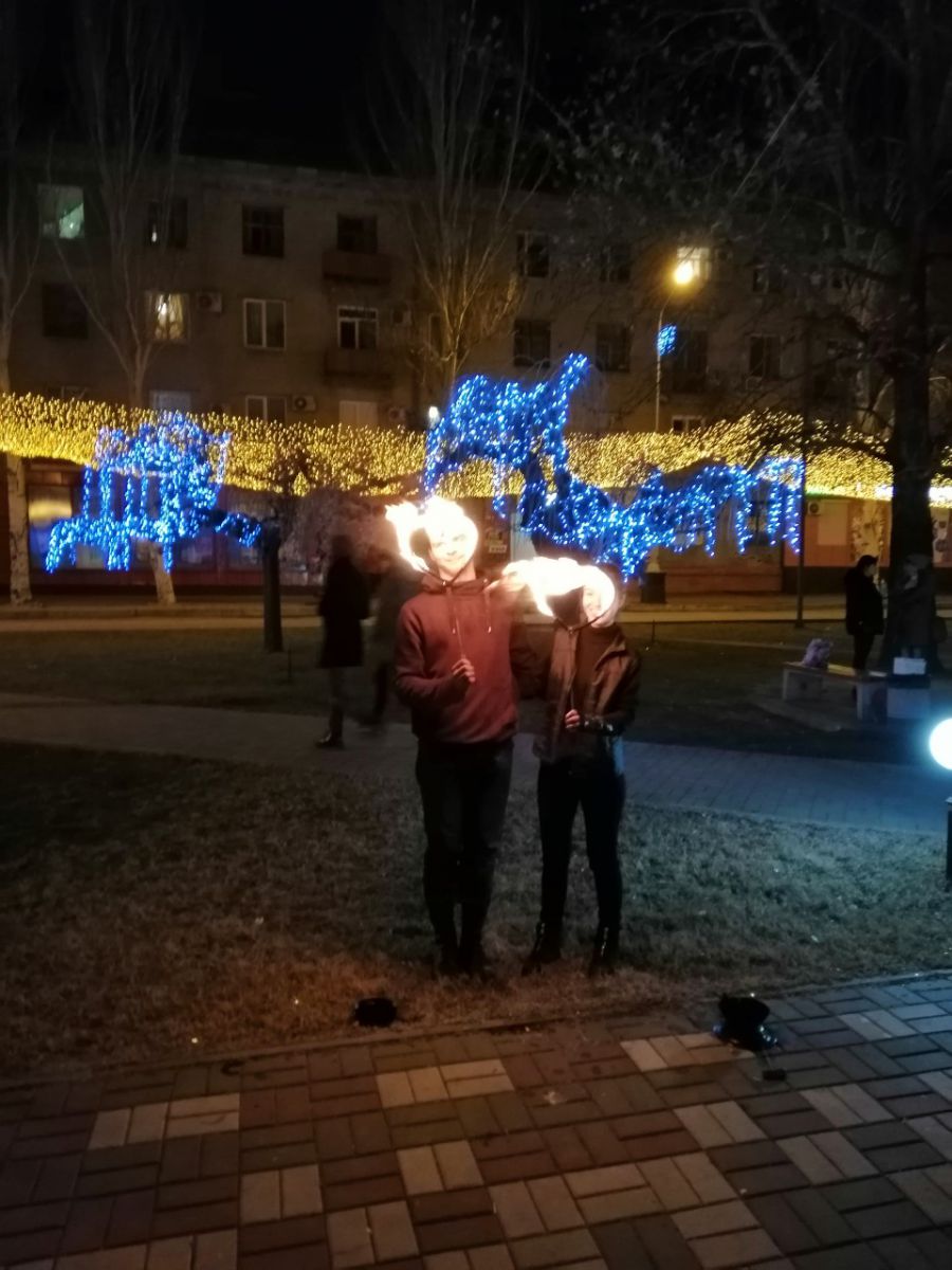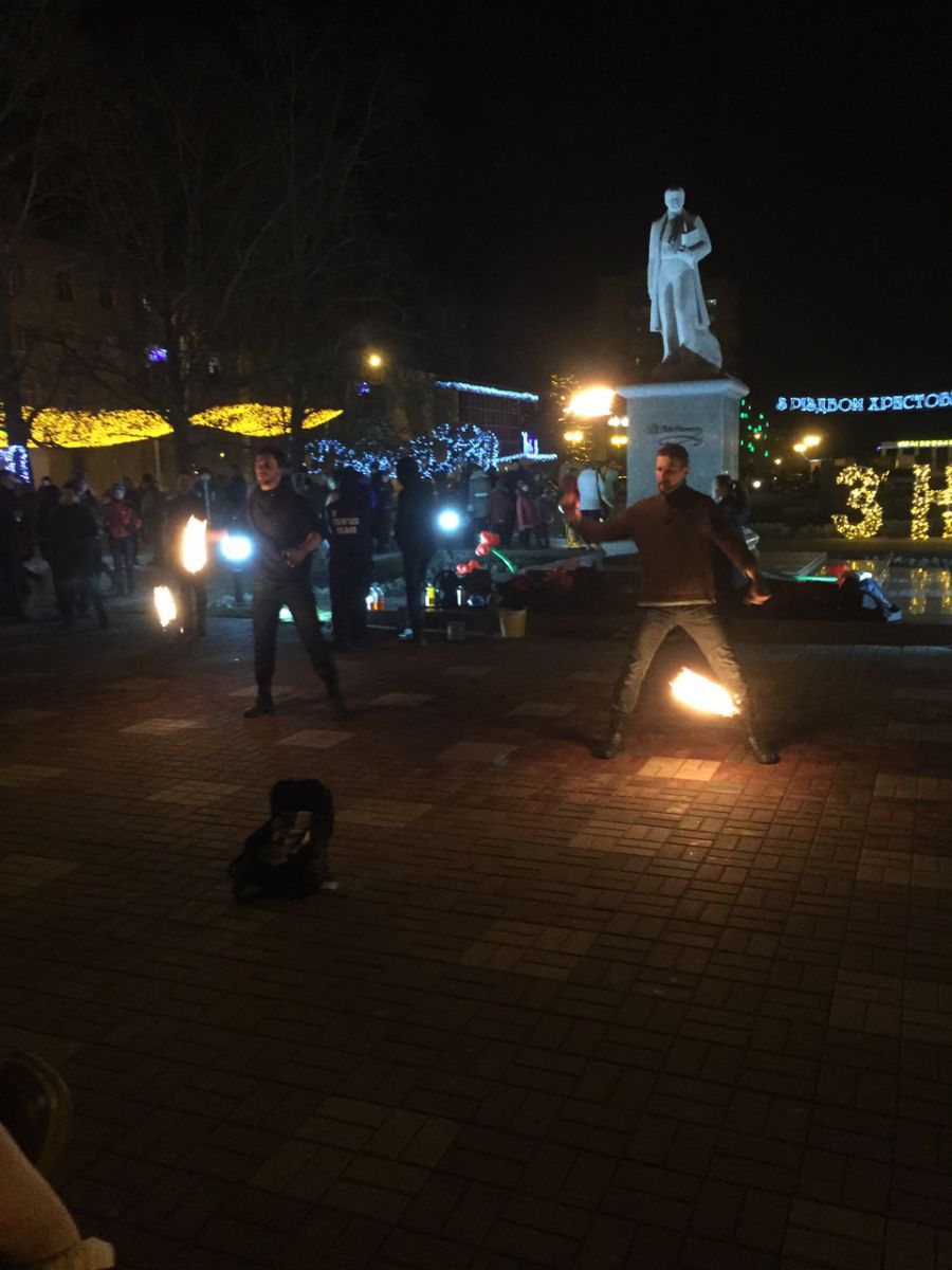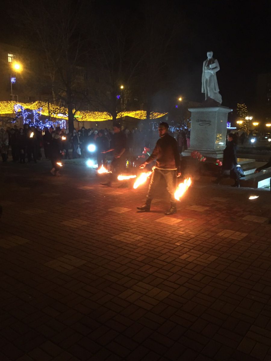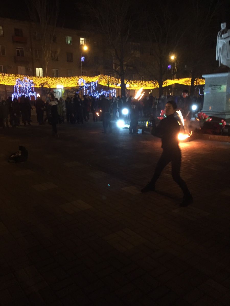 Вчера, в День влюбленных, на главной площади Мелитополя участники первого в нашем городе коллектива фаерщиков «Атар» устроили для горожан яркое фаер-шоу.