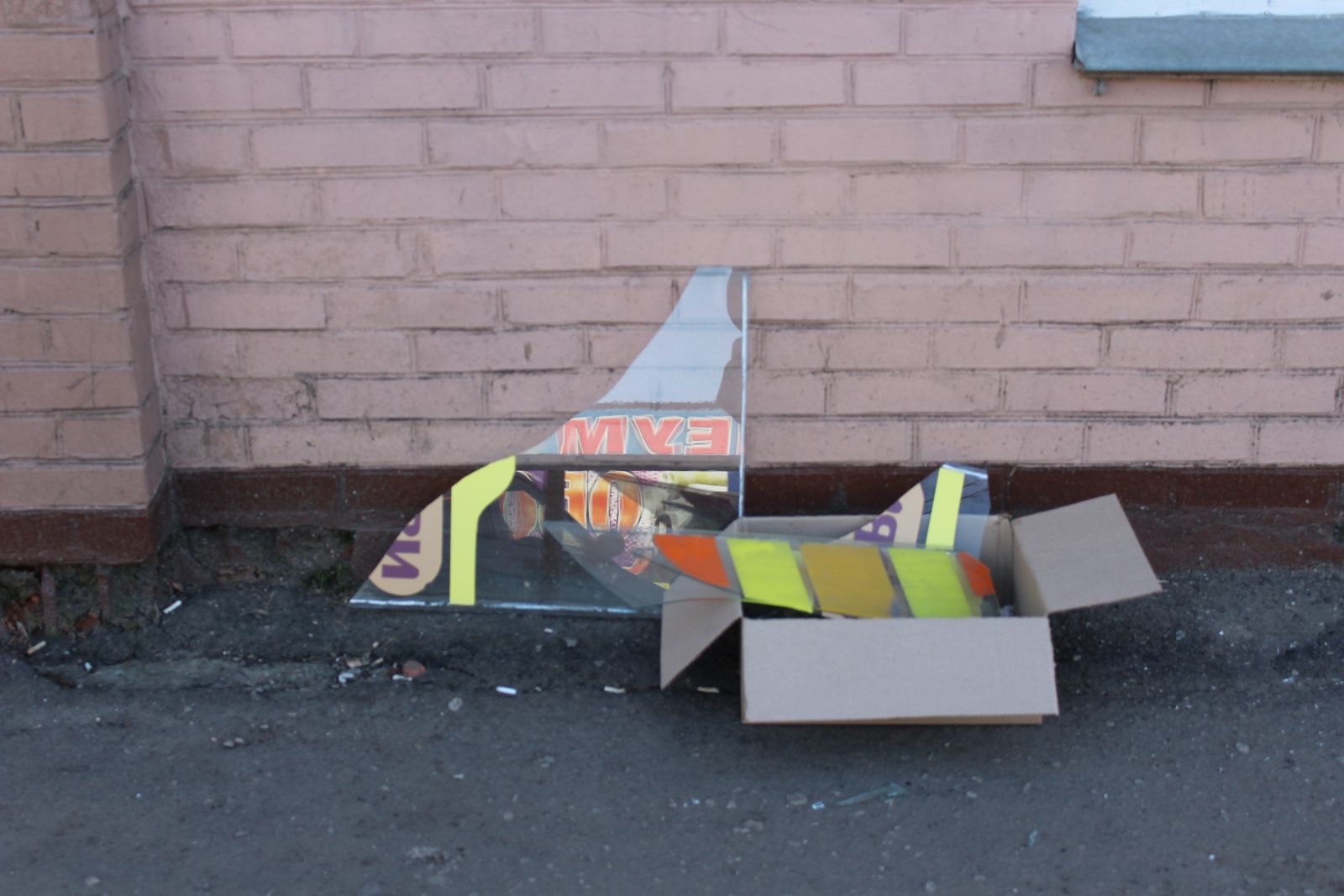 Отметим, разбитые окна уже заменили, но следы погрома еще видны. Рядом с магазином стоит коробка с остатками разбитой витрины.