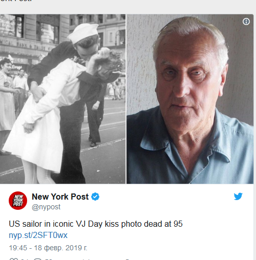 В США умер моряк с фотографии военных лет «Поцелуй»
