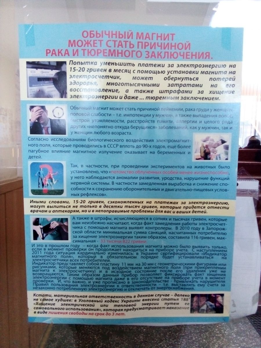 Неодимовые магниты, которые любители сэкономить ставят на счетчики, могут стать причиной многих заболеваний. Так, по крайней мере, говорится в брошюрке, висящей в абонентском отделе МГРЭС.
