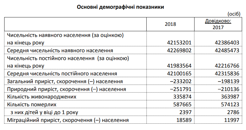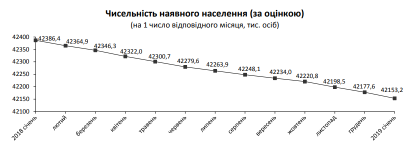 По предварительным оценкам, на 1 января 2019 года в Украине проживало 42 млн 153,2 тыс. человек.
