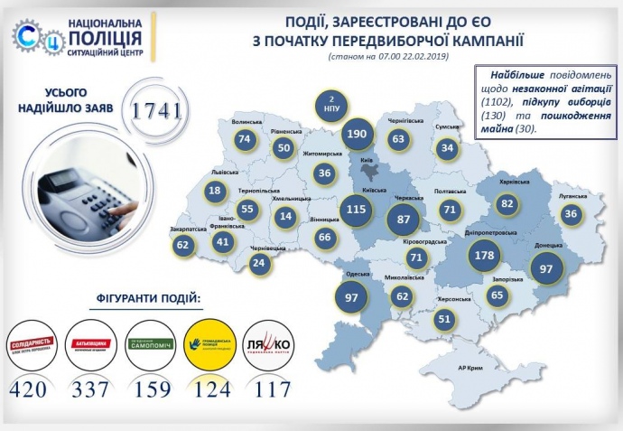 С начала президентской избирательной кампании в Национальную полицию поступило 1741 сообщение о нарушениях, сообщили в пресс-службе ведомства 22 февраля.