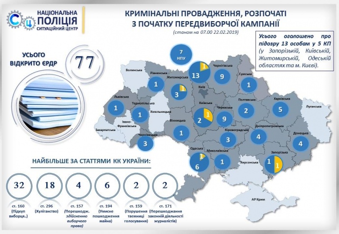 На сегодняшний день по данному факту открыты 77 уголовных производств, из которых 39 касаются нарушений избирательного законодательства, а 38 – проведения самой избирательной кампании. В рамках производств 13 личностям были объявлены подозрения.
