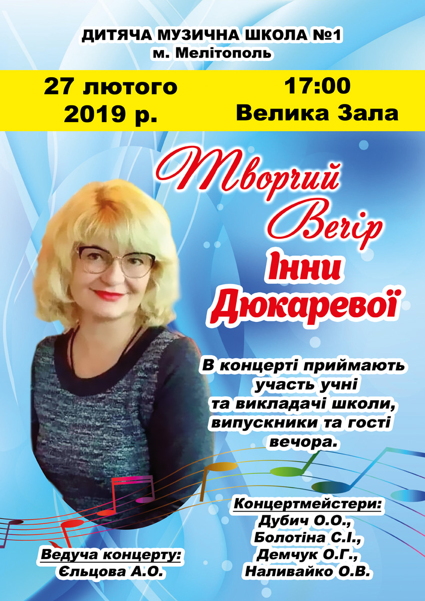 27 февраля в большом зале Детской музыкальной школы № 1 состоится творческий вечер Инны Дюкаревой.