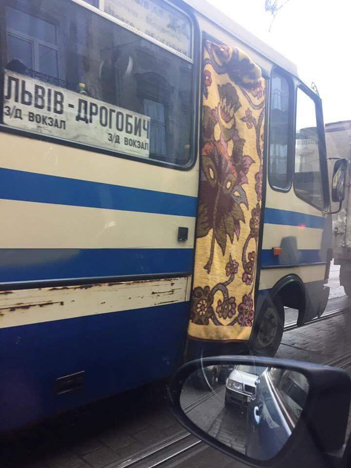 В сети появилось шокирующие фото из междугороднего автобуса сообщением Львов-Дрогобы, в котором вместо двери прикреплено одеяло, сообщает "Факты".