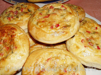 4. Отрезать от теста небольшие кусочки и раскатать в лепешки. Сделать в каждой лепешке небольшое углубление для начинки и выложить на смазанный растительным маслом противень.