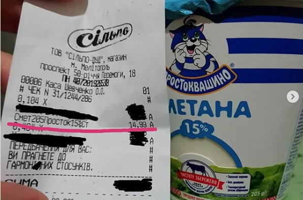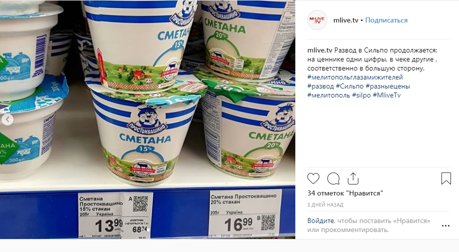 Совсем недавно подобный пост появился в одном из пабликов в Іnstagram. На этот раз мелитопольцы поймали "Сильпо" на несоответствующих ценах на сметану. Если верить ценнику на полке, то стоимость сметаны "Простоквашино" 15 проц. жирности - 13,99 грн. А вот в чеке цена совсем другая - 14,99 грн.
