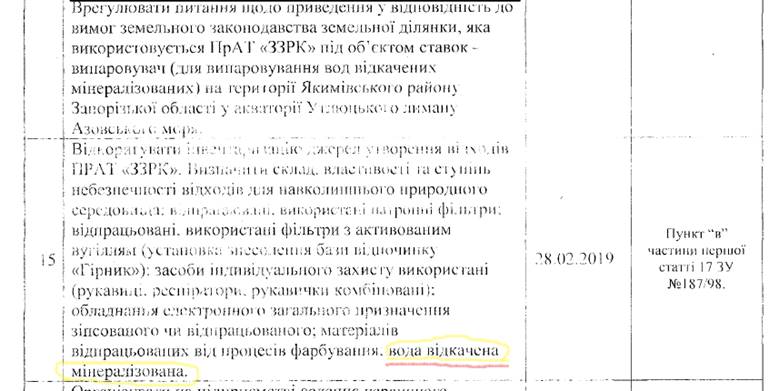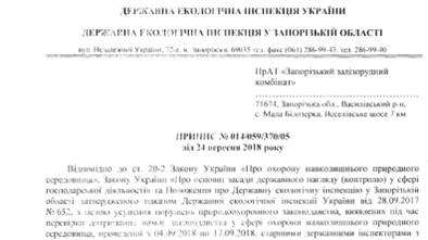 Как ранее сообщалось, уполномоченные сотрудники Государственной экологической инспекции в Запорожской области по результатам проверки ЧАО «ЗЖРК» выдали предписание, которым обязали должностных лиц комбината внести изменения в инвентаризацию отходов и добавить туда высокоминерализованную шахтную воду, которая до этого вообще не учитывалась комбинатом как отходы. Кроме этого, предписание указывало на необходимость оформить в установленном порядке документы, касающиеся пользования земельным участком площадью 4000 га в качестве пруда-испарителя.