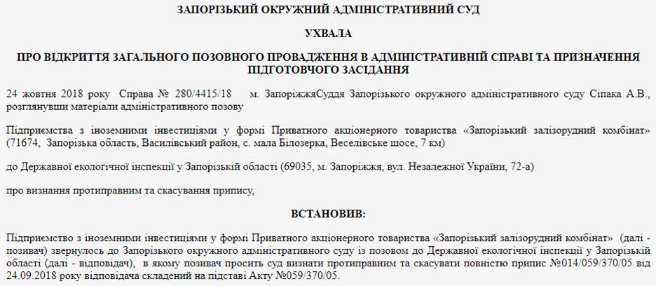 Очевидно, не желая тратиться, должностные лица ЗЖРК обратились с иском в Запорожский окружной административный суд к областной Госэкоинспекции с требованием полностью отменить указанное предписание.