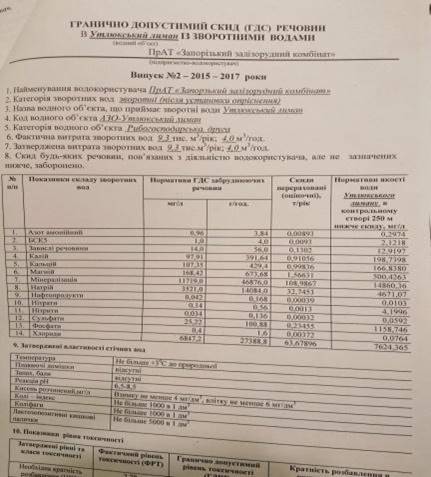 Согласно п. 1310.2.9.02 Государственного классификатора отходов Украины ДК 005-96, вода откачанная минерализованная является отходом добывания металлических руд. Это – не возвратная вода, и она загрязняет окружающую среду. И, в соответствии с предельно допустимым сбросом веществ с возвратными водами в Утлюкский лиман (см. документ ниже), минерализация сбрасываемой воды составляет 11719 мг/литр, а фоновая концентрация воды пруда-испарителя – 14860,36 мг/литр.