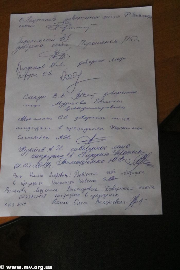 Напомним, что три доверенных лица подписали декларацию еще во время первого заседания. Также свои автографы под документом оставили: Игорь Богданов (от имени кандидата в президенты Сергея Таруты), Владислав Сакун (от Евгения Мураева), Владимир Авраменко (от Александра Соловьева), Андрей Куртев (от Юлии Тимошенко), Даниил Енин (от Александра Шевченко) и Людмила Рослякова (от Олега Ляшко).