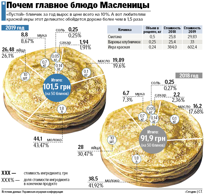Аналитики Украинской аграрной конфедерации (УАК) посчитали, что в этом году стоимость 50 блинов перевалила за 100 грн, составив 101,5 грн. Это на 9,6 грн, или же на 10,4 %, дороже, чем в прошлом году. Для сравнения: в 2018 году символ Масленицы прибавил 40% по сравнению с 2017-м. Из всех ингредиентов, необходимых для приготовления блинов, больше всего подорожало сливочное масло — на 36,5 грн/кг, или на 22,4%. Ныне цена этого продукта в среднем составляет 190 грн/кг. Подорожала и мука — почти на треть — на 3 грн/кг, кг муки ныне в среднем стоит 12,57 грн. Стоимость соли не изменилась. А вот цены на сахар и яйца в этом году радуют: десяток яиц подешевел на 1,5 грн, или на 5,4%, благодаря достаточному производству этого продукта в Украине. Сахар снизился в цене на 1,6 грн./кг, или на 10,5%, под влиянием мирового тренда.
