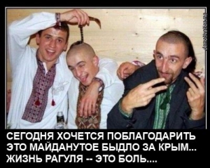 Правда ,неужели стало доходить через задницу,раз башка в кострюле не варит ? А может лучше поскакать повыше ,или покрасить в жовтоблакытный тротуар или туалет,заскулить "Щенэвмэрлу" на тэлячей мове и пару памятников снести .Зачем кукрам одежда,зачем жратва ,сала нажрался,напялил вышиванку и шаровары и гопака.... и орать как ошпареные в сраку - Сала хэроям,слава секенхендам,будем донашивать гейропейские обноски!Ура .перэмога,здобулы!