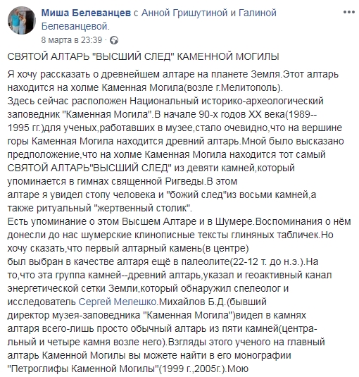 Заведующая отделом истории Национального историко-археологического заповедника «Каменная Могила» Ольга Заматаева пояснила журналистам «МВ», что действительно на Каменной Могиле существует религиозно-обрядовое место, именуемое алтарем. Однако оно состоит из шести камней, пять из них располагаются вокруг одного центрального, а не из девяти, как пишет в своем посте М. Белеванцев. Также сотрудники заповедника сообщили, что М. Белеванцев работал в заповеднике, но не в качестве историка, а в качестве смотрителя.