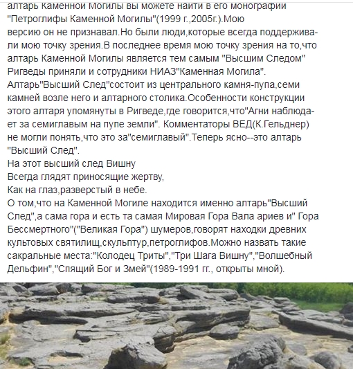 Пост о своей находке упомянутый гражданин разместил в социальной сети «Фейсбук». Он пишет, что обнаружил на Каменной Могиле святой алтарь, который состоит из девяти камней. Этот алтарь упоминается в гимнах священной Ригведы: