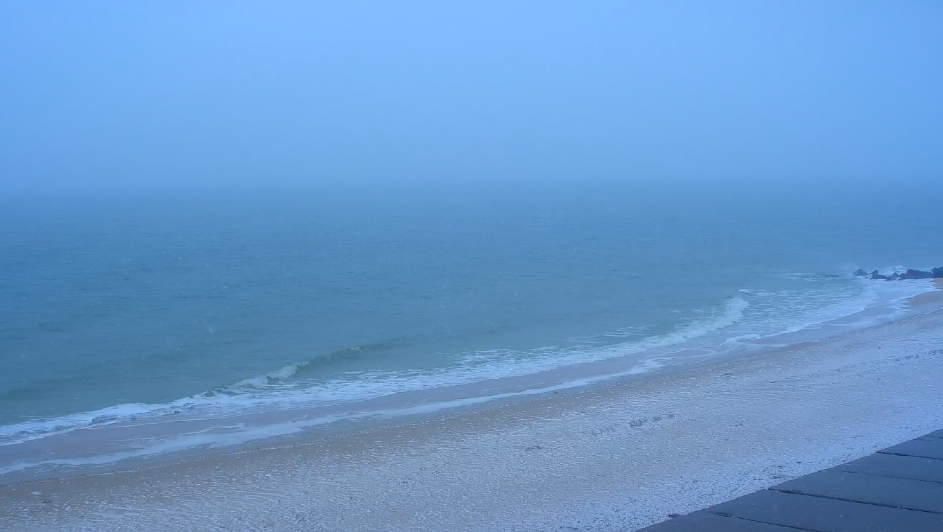 Снег сыплет крупными хлопьями, и берег моря покрывается белой вуалью. А умеренный ветер гонит волны к заснеженному берегу.