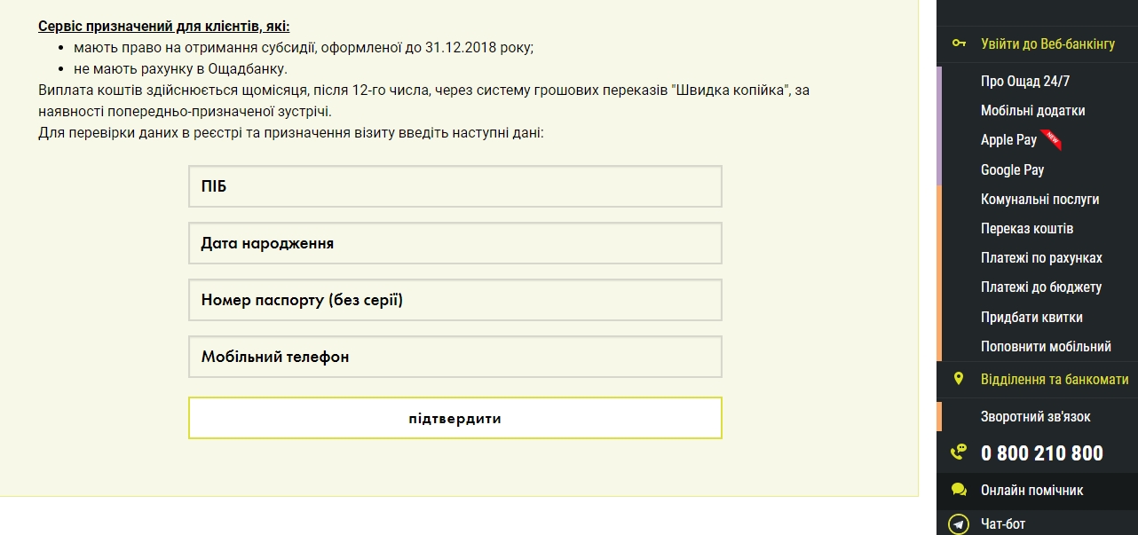 Но не все мелитопольцы знают, что нужно для того, чтобы получить субсидию наличными в банке. Некоторые субсидианты, которые уже вчера посетили отделение "Ощадбанка", рассказали журналисту "МВ" о том, что сотрудники банка их перенаправили на горячую линию финучреждения. Позвонив на горячую линию, мелитопольцы должны выбрать дату и время, которое им подходит (если оно свободно), а также отделение банка, в котором хотят получить субсидию, и в выбранный день явиться в "Ощадбанк". Предварительно записаться в отделение "Ощадбанка" для получение субсидии наличными можно и на сайте банка, кликнув на окошко "записатись на зустріч".