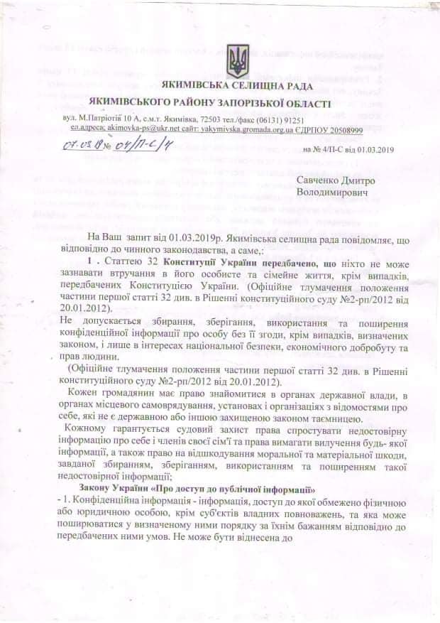 Очень странный ответ дали в Акимовском поссовете активисту. В ответе говорится о том, что информацию о зарплате чиновников предоставить не могут, так как это вмешательство в личную и семейную жизнь чиновников. Только в чем, собственно, вмешательство и при чем здесь семейная жизнь - остается загадкой.