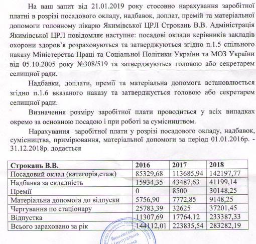 В отличие от Акимовского поссовета, на запрос активистов на получение информации о доходах главврача Акимовской ЦРБ Валерия Строканя администрация больницы ответила достаточно быстро и без каких-либо проблем.