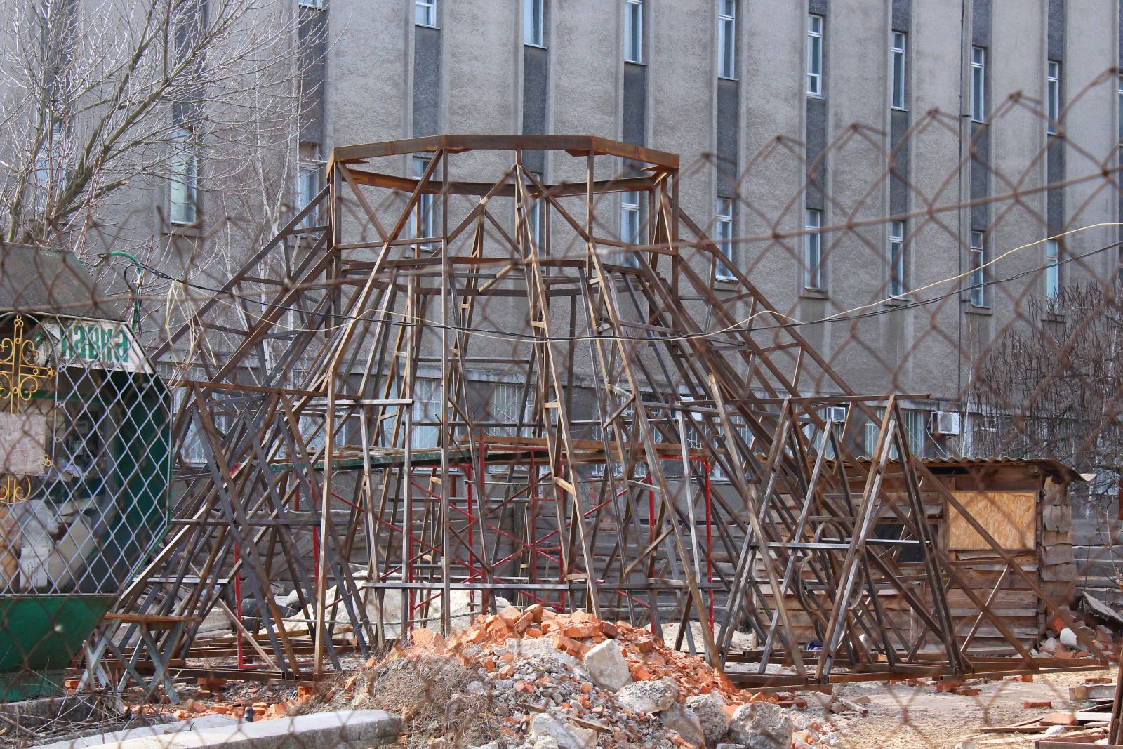 Долгое время строительство шло очень медленно, но за последний год храм значительно вырос. А вот недавно во дворе культового учреждения появился металлический каркас.