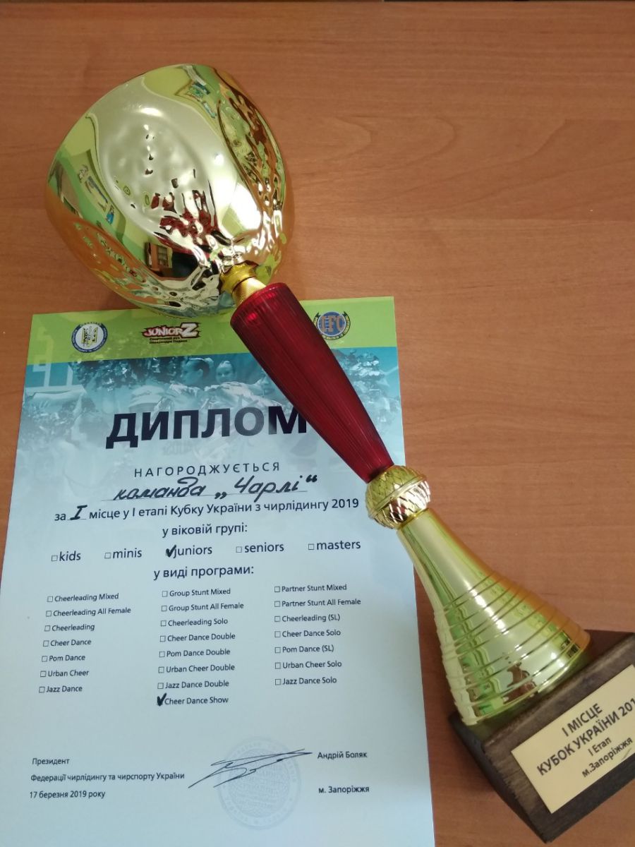 Коллектив «Чарли», которым руководит Татьяна Корчака, занимается чирлидингом второй год. И если соревнования по хореографии для них – привычное дело, то вот в конкурсе по чирлидингу они принимали участие впервые. Выступал коллектив в возрастной категории юниоры в номинации Cheer-dance-show. Домой «Чарли» возвращались с кубком за I место.