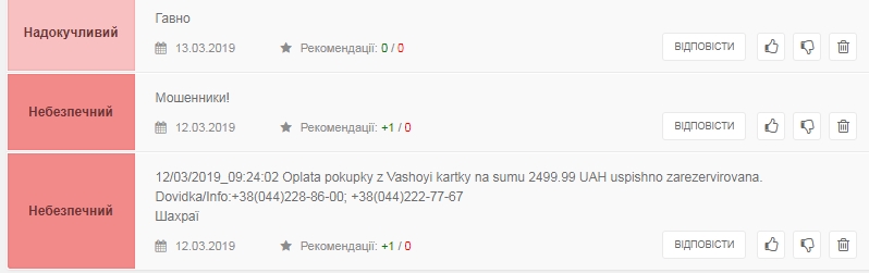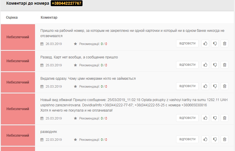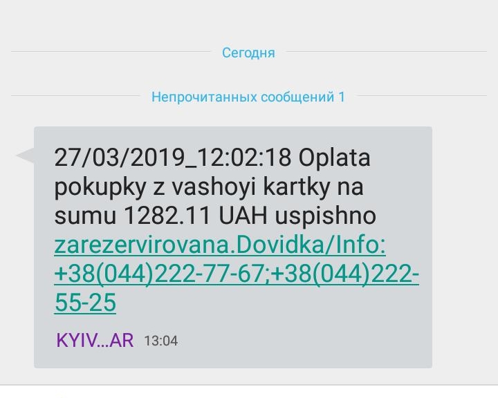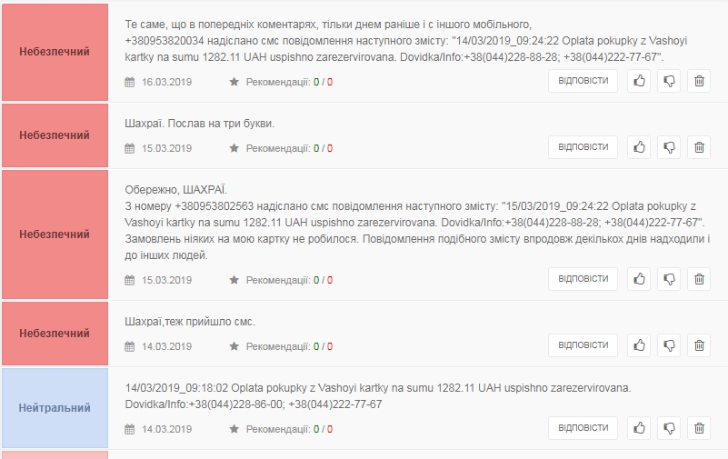 - «Обережно, ШАХРАЇ. З номеру +380953802563 надіслано смс повідомлення наступного змісту: «15/03/2019_09:24:22 Oplata pokupky z Vashoyi kartky na sumu 1282.11 UAH uspishno zarezervirovana. Dovidka/Info:+38(044)228-88-28; +38(044)222-77-67. Замовлень ніяких на мою картку не робилося. Повідомлення подібного змісту впродовж декількох днів надходили і до інших людей».