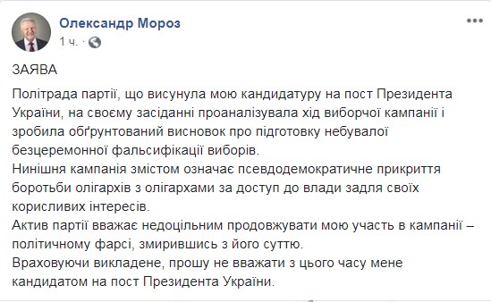 В среду, 27 марта, бывший спикер Верховной Рады Александр Мороз заявил о своем решении сойти с президентской гонки.