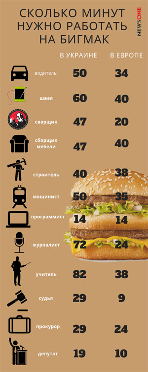 Если учитывать, что украинец в среднем работает в месяц 22 дня по 8 часов в день, то можно рассчитать примерную стоимость часа его рабочего времени. А поделив получившуюся сумму на стоимость бургера (54 гривни), получим сумму бургеров, которую украинец может заработать за час.