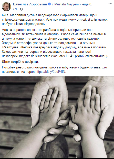 "Киев. Малолетний ребенок неоднократно жаловалась матери, что ее сожитель домогается. Но при медицинском осмотре, по словам матери, не было никаких подтверждений", - говорится в сообщении.