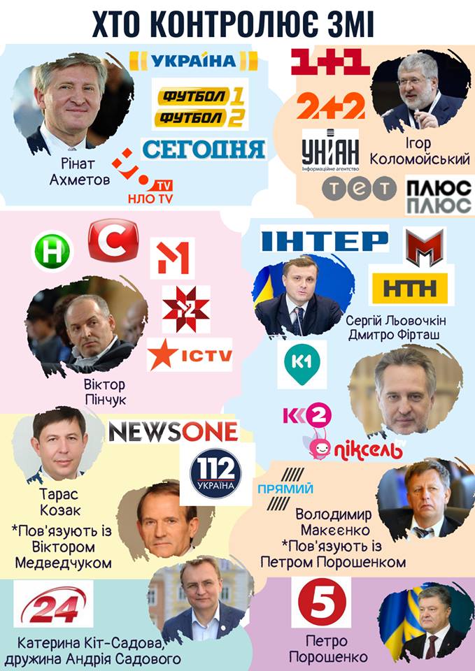 На инфографике вы найдете пометку * рядом с каналами 112 Украина, NewsOne и Прямой. Эксперты и медиа связывают эти СМИ с другими людьми, чем бенефициарный владелец. Также о таком влиянии свидетельствует контент этих СМИ и редакционная политика.