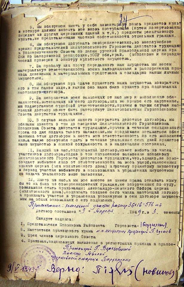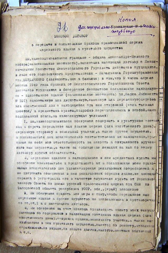 09.04.1949 года религиозная община собора заключила с горисполкомом, в лице его представителя - начальника Горжилуправления тов. Бордаченко, договор о передаче в безоплатное пользование (обратите внимание, в пользование, а не во владение) прихода православной церкви, церковного здания и культового имущества.