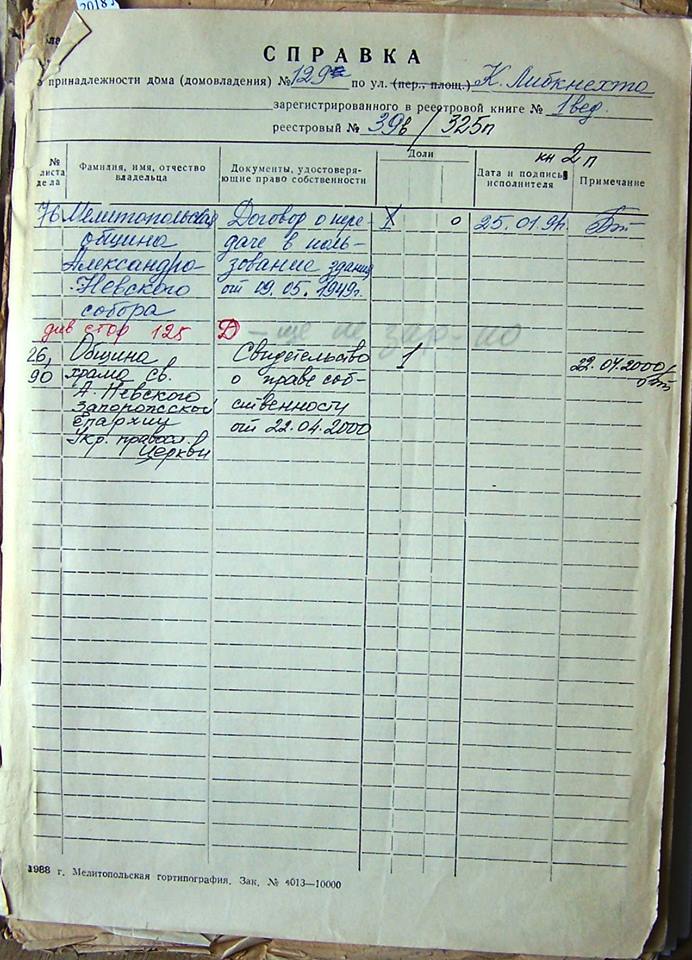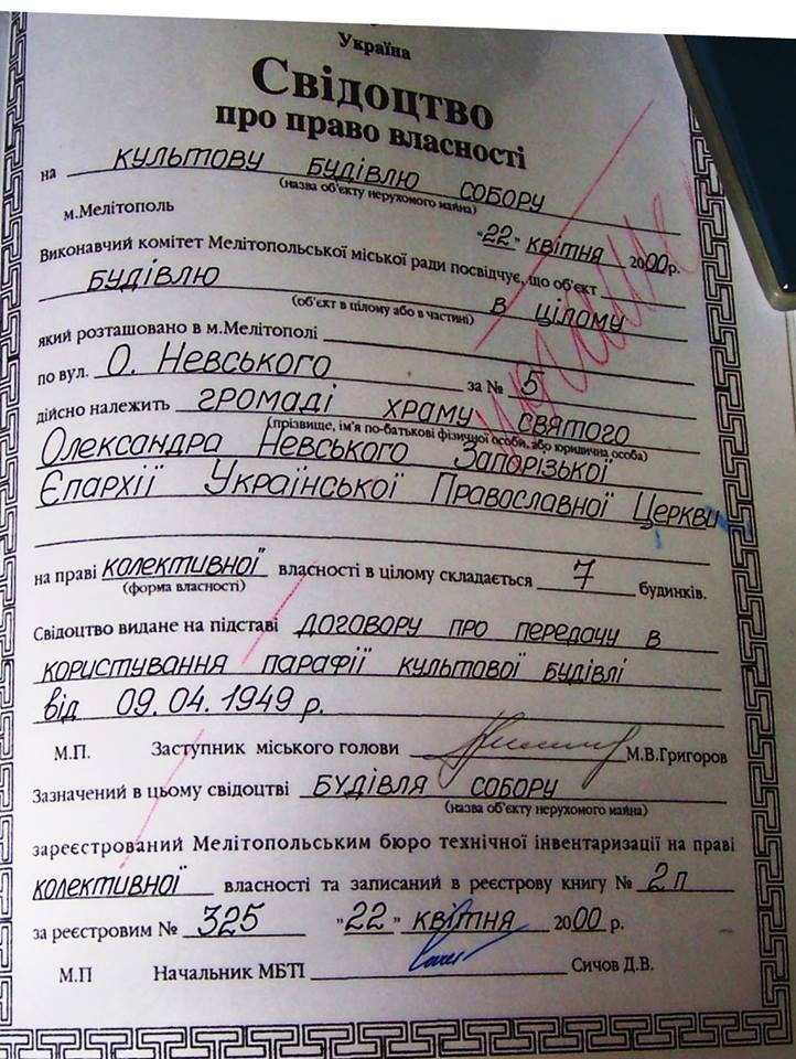 В Мелитопольском БТИ я ознакомился с инвентаризационным делом собора, и первое, что я обнаружил - это "Свидетельство о праве собственности" на все 7 (семь) зданий собора, которое БТИ выдало: "на основании договора о передаче в пользование прихода культового здания от 09.04.1949 года".