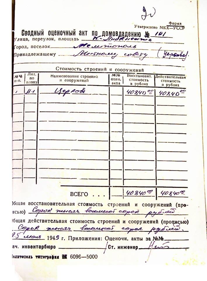 Согласно сводного оценочного акта от 05.05.1949 года, здание собора (в акте указано: "Церковь") на тот момент принадлежало Мелитопольскому городскому совету (в акте: Местного совету).