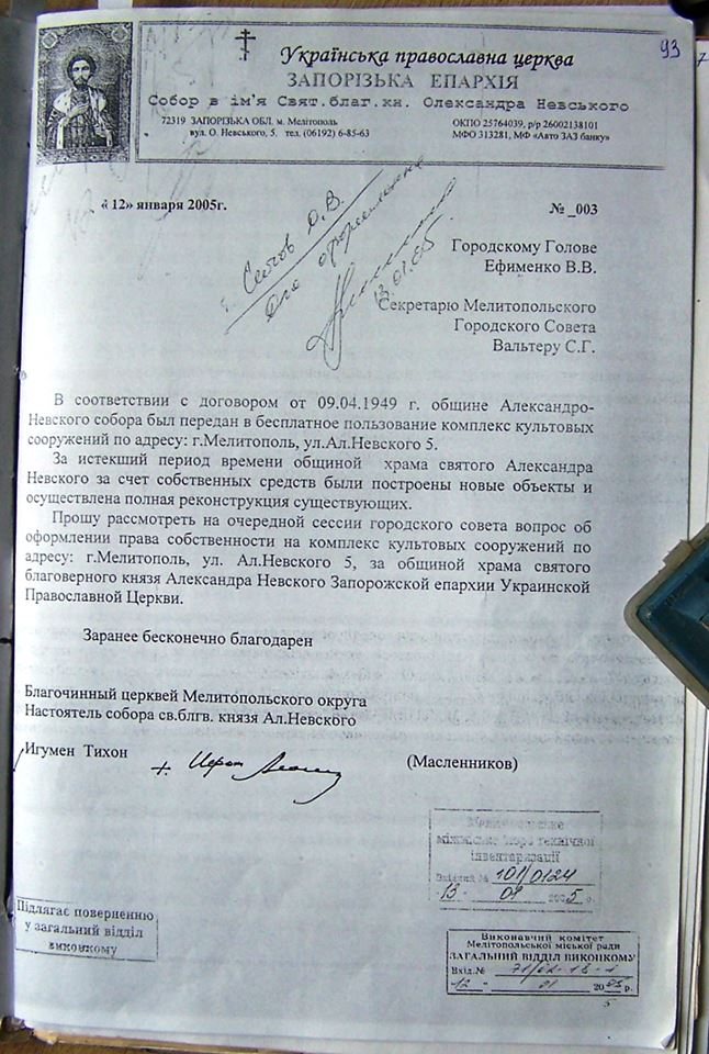 "За истекший период времени общиной храма святого Александра Невского за счет собственных средств были построены новые объекты и осуществлена полная реконструкция существующих. Прошу рассмотреть на очередной сессии городского совета вопрос об оформлении права собственности на комплекс культовых сооружений по адресу: г.Мелитополь, ул. Ал.Невского 5, за общиной храма святого благоверного князя Александра Невского Запорожской епархии Украинской Православной Церкви".