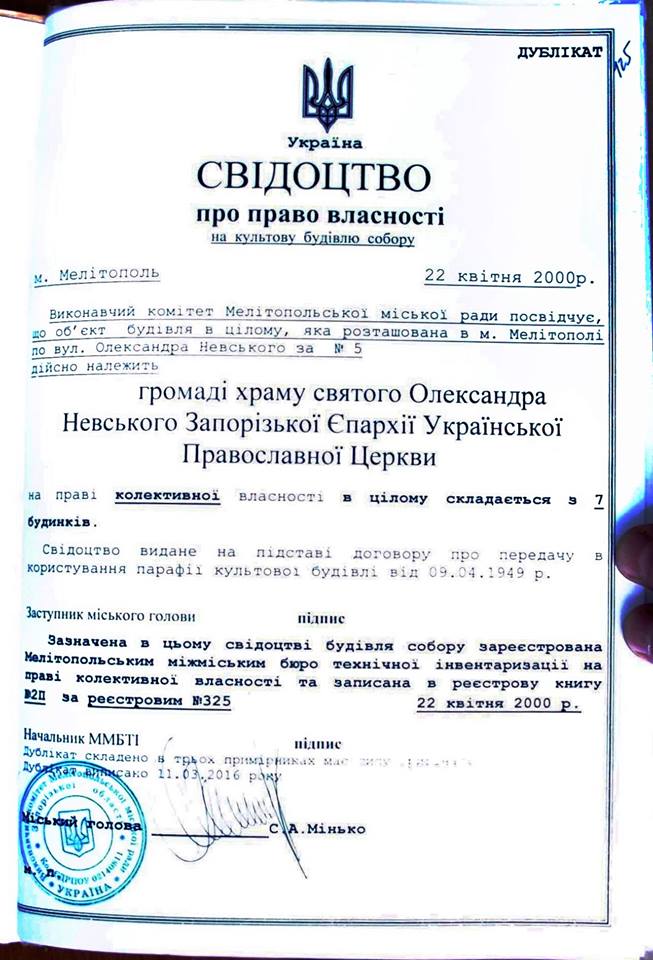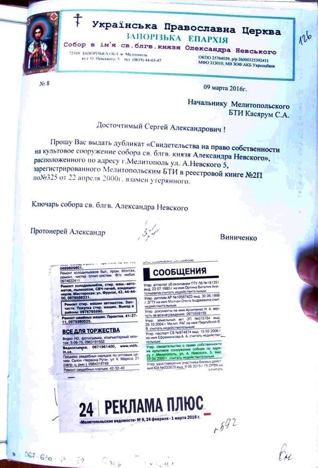09.03.2016р. протоирей собора подает начальнику БТИ заявление об утере свидетельства о праве собственности и получает его дубликат за подписью Мелитопольского городского головы Минько С.А.