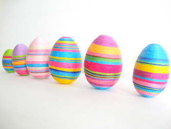 Несколько вариаций на тему декорирования яиц: с помощью бумажных ленточек, лака, ткани, ниток.