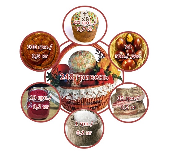 В нее вошли шесть традиционных для освящения в храме компонентов: пасхальный кулич (0,7 кг – 44 грн), домашняя колбаса (0,5 кг – 130 грн), яйца (10 штук – 24 грн), сало (0,5 кг – 39 грн), хрен (0,2 кг – 10 грн), соль (0,2 кг – 1 грн).