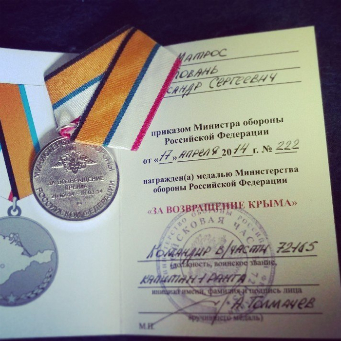 В социальной сети Барабаш прямо пишет, что медали им вручили «за Крым».