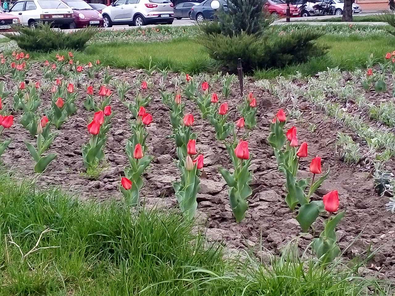 Тюльпаны на площади пока еще не цветут полноценно, но многие уже красуются красными бутонами.