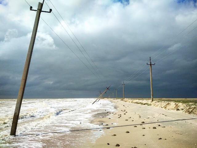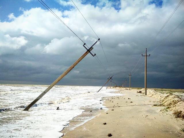 В Кирилловке опоры линий электропередачи затопило море, в результате чего они основательно накренились.