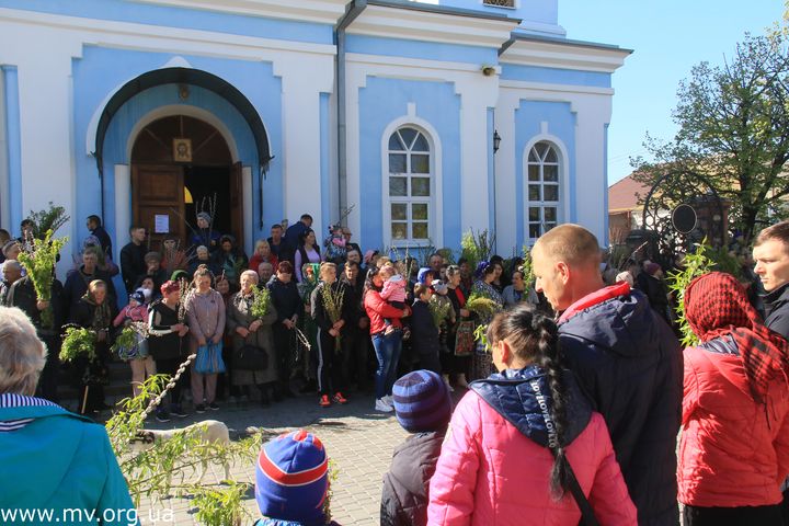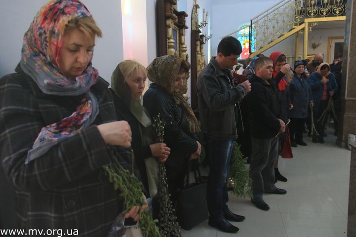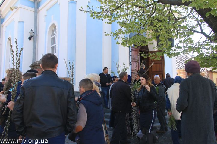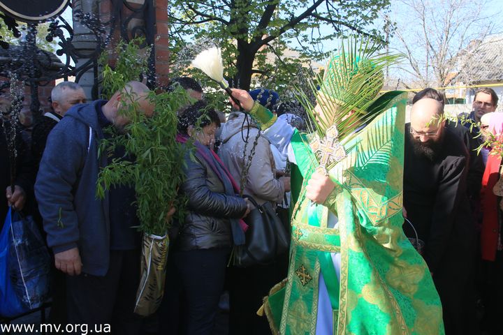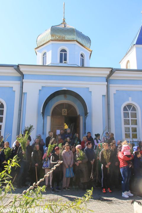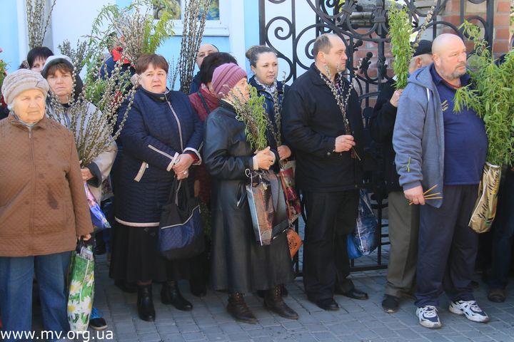 Мелитопольцы тоже поспешили с самого утра посетить местные храмы. Так, в Александро-Невском соборе уже закончилась служба и началось освящение вербы. Людей здесь очень много, не протолкнуться. Все толпятся у входа во внутренний дворик церкви с охапками вербы, купленными по дороге к храму. И вот выходит священнослужитель храма и кропит всех святой водой. Близ храма расположились торговцы вербой.