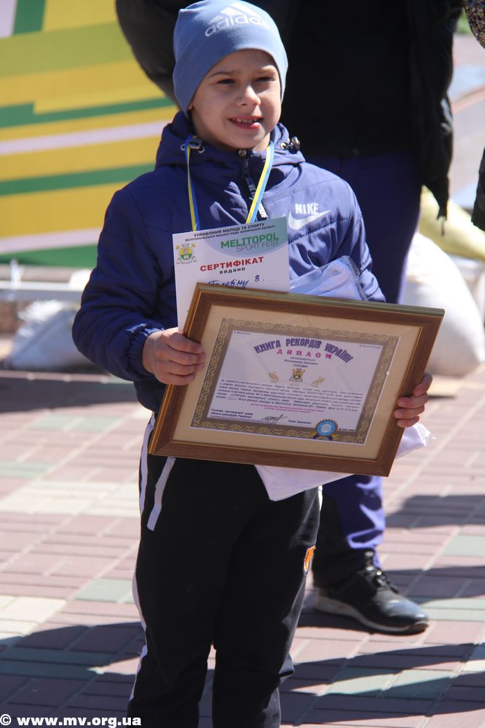 Сразу же после торжественного открытия спортивного праздника воспитанник отделения художественной гимнастики ДЮСШ № 1 Владимир Головин установил рекорд Украины в упражнении «спичак». Восьмилетний мелитополец выполнил в этом упражнении 101 поднятие, которое зафиксировал директор проекта «Книга рекордов Украины» Игорь Пидчибий: