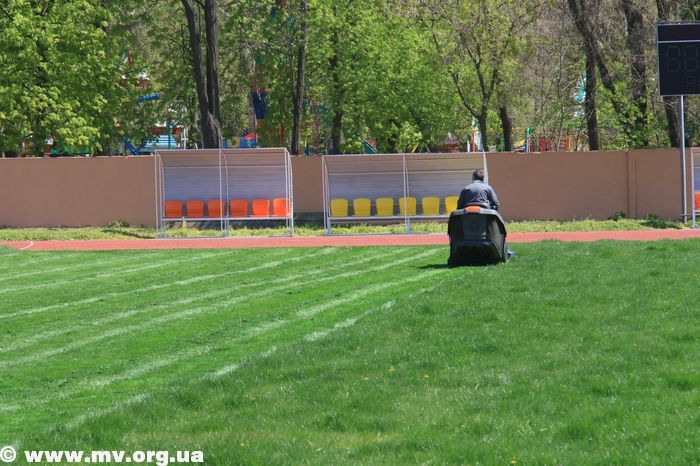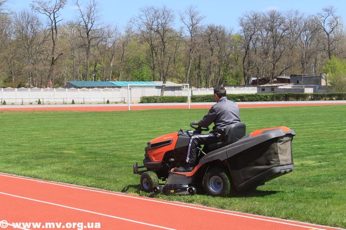 Сегодня здесь продолжают проводить различные работы. В частности, с помощью специальной техники здесь стригут траву на футбольном поле.