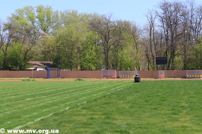 Спецтехника стрижет траву на футбольном поле в Мелитополе