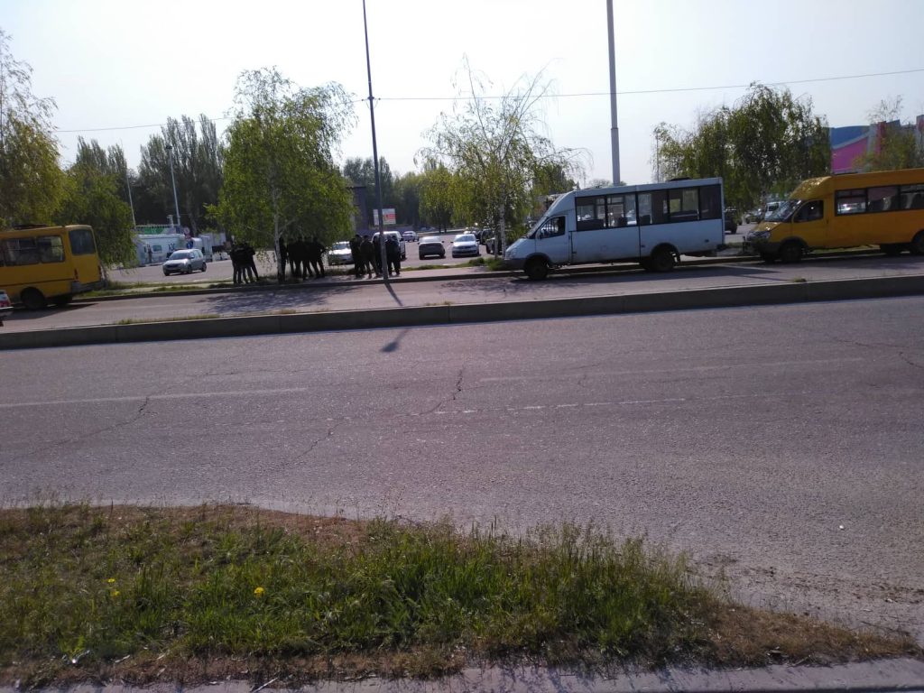 Въезд на территорию заправки заблокирован с обеих сторон сразу несколькими автомобилями. Возле «Амстора» находятся сотрудники охранных фирм и группы молодых людей.