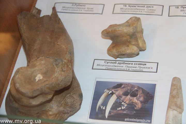 В основном все они из частной коллекции, однако есть и завезенные из Крыма: останки динозавра мезозойского периода и белемниты (чертовы пальцы). А из Токмака в Акимовский музей были привезены останки саблезубого тигра.